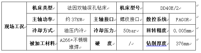 為驗證創恒BTA深孔鉆性能,企業在法因雙軸深孔鉆床DD40E/2上開展對比測試:機床主軸功率約37KW,使用 FAGOR 數控系統,采用50bar油壓內冷方式,對A266+不銹鋼堆焊材料(鉆削厚度376mm)進行加工,全程跟蹤記錄成孔精度