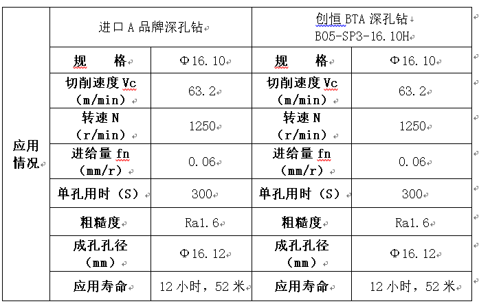 從表格數據可以清晰看到,在相同的現場工況下,創恒 BTA 深孔鉆在切削效率、成孔質量、耐用度等**指標上,與進口A品牌深孔鉆完全一致!這意味著,創恒刀具不僅能滿足高精度加工要求,更能在性能穩定性和長期經濟性上與進口刀具比肩抗衡!