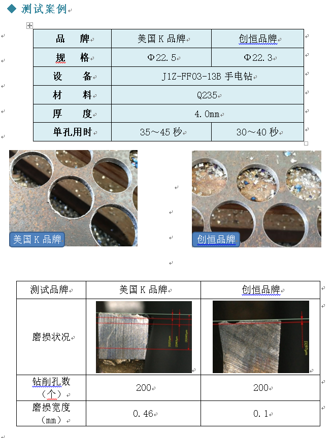 同樣用飛機鉆鉆4.0mm厚的Q235材料,創恒薄板孔鉆在時間效率上已展露出優勢。耐用性方面,對比更是明顯,美國K品牌薄板孔鉆磨損寬度達0.46mm,刀具性能下滑,后續加工精度、質量難保障,還容易因過度磨損報廢,得頻繁換刀,耽誤生產。創恒品牌薄板孔鉆磨損寬度*0.1mm,耐用性佳,能長時間穩定保證加工精度,減少換刀次數,幫企業降低成本,提高經濟效益。